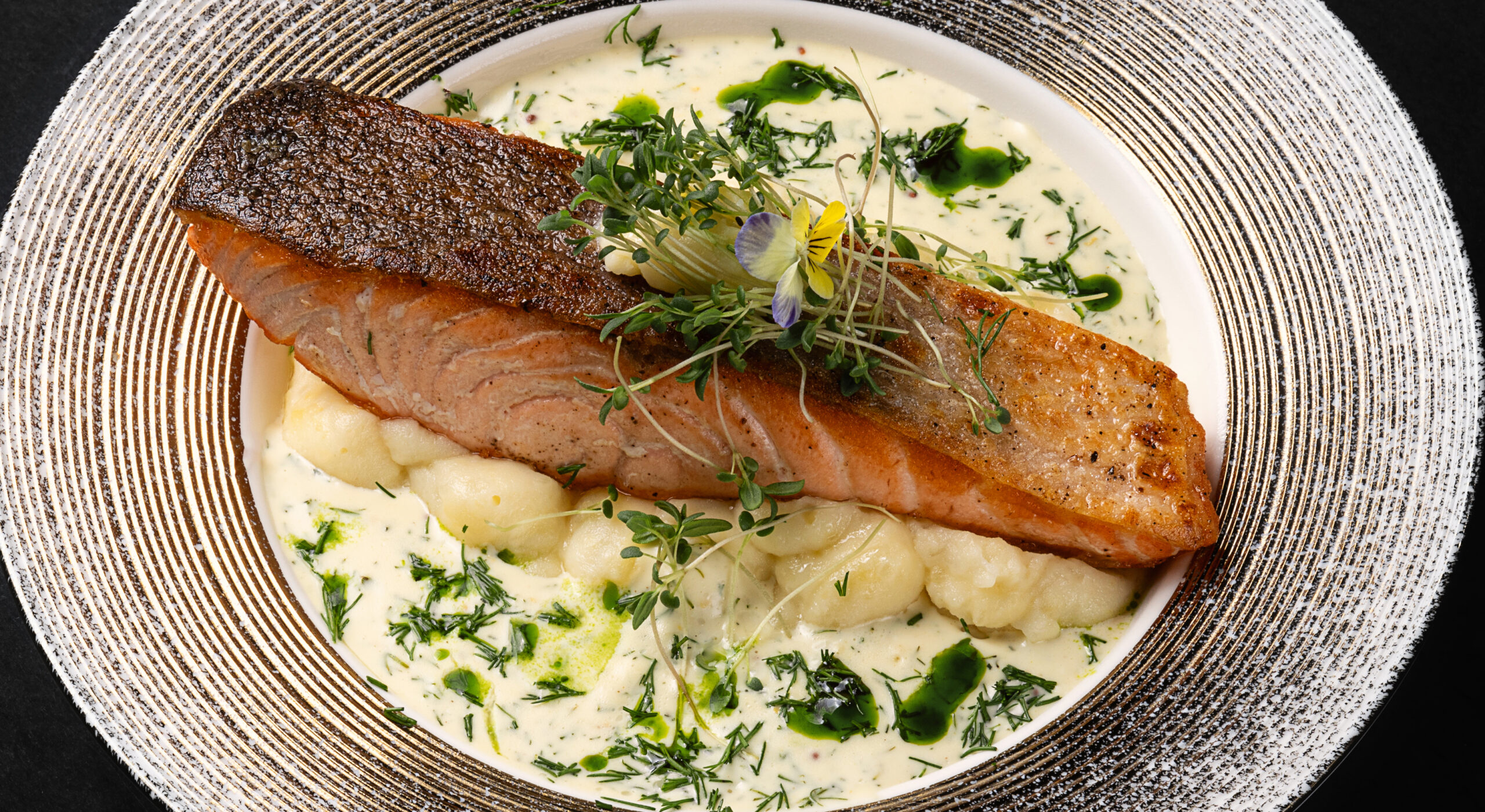 ۱۸۰ تا ۲۰۰گرم فیله ماهی سالمون نروژ تازه همراه با سس خامه ای شوید، سرو با اسفناج و پوره سیب زمینی.