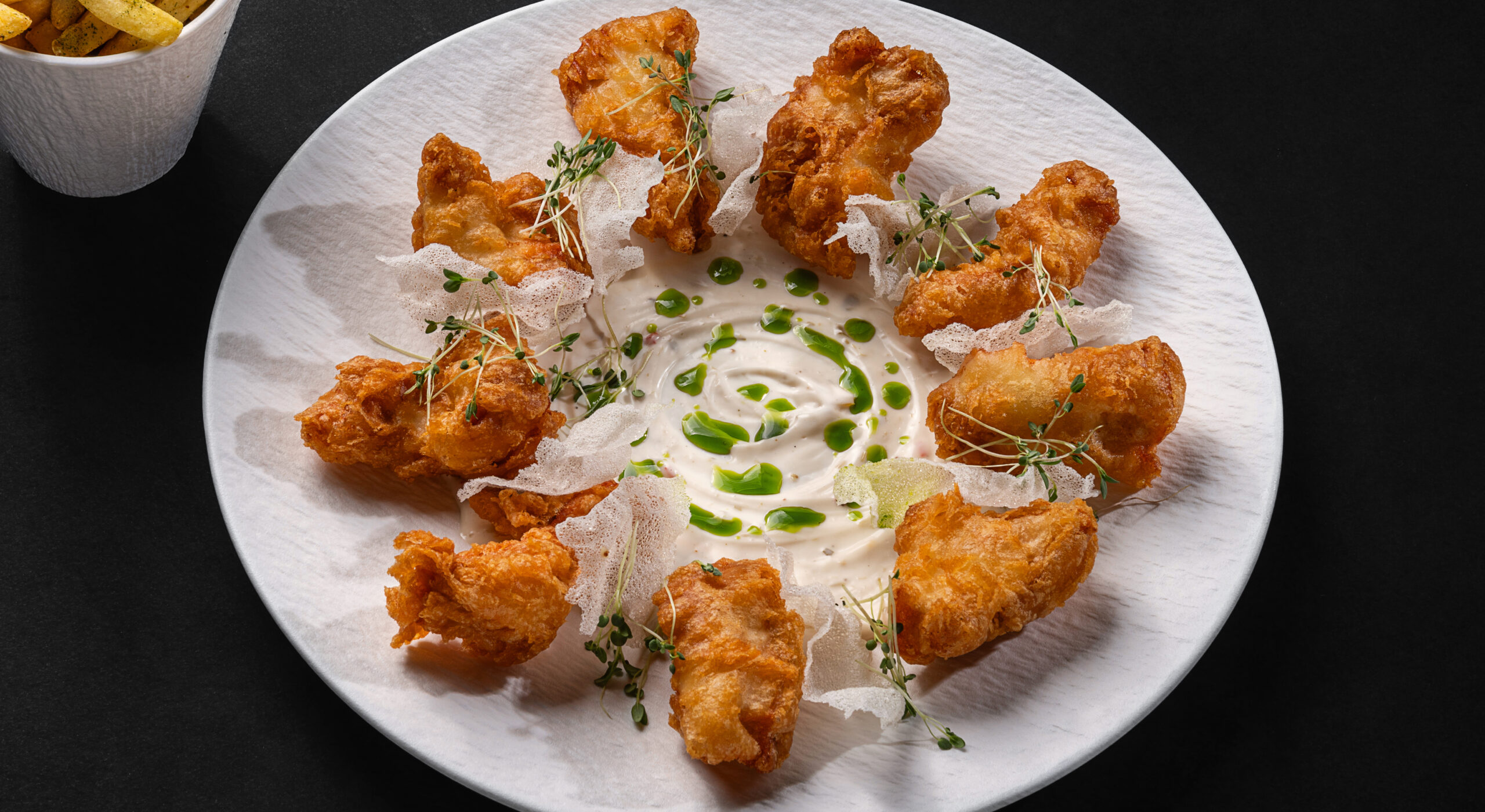 ۲۳۰ تا ۲۵۰ گرم فیله ماهی تازه، سرخ شده با مایع بنیه سرو با سیب زمینی سرخ شده و سس تارتار.