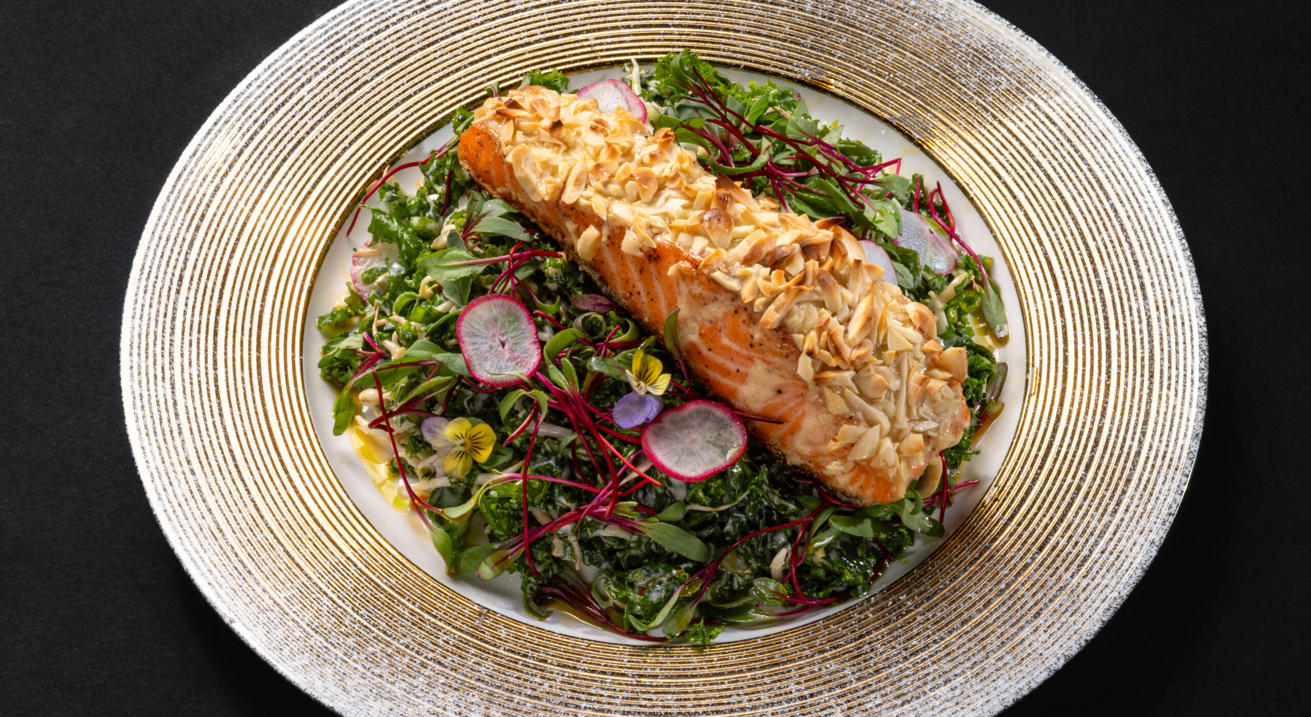 ۱۸۰ تا ۲۰۰ گرم فیله ماهی سالمون نروژی تازه گریل شده با روکش بادام بو داده و سس آیولی روی سطح ماهی به همراه سالاد کیل.