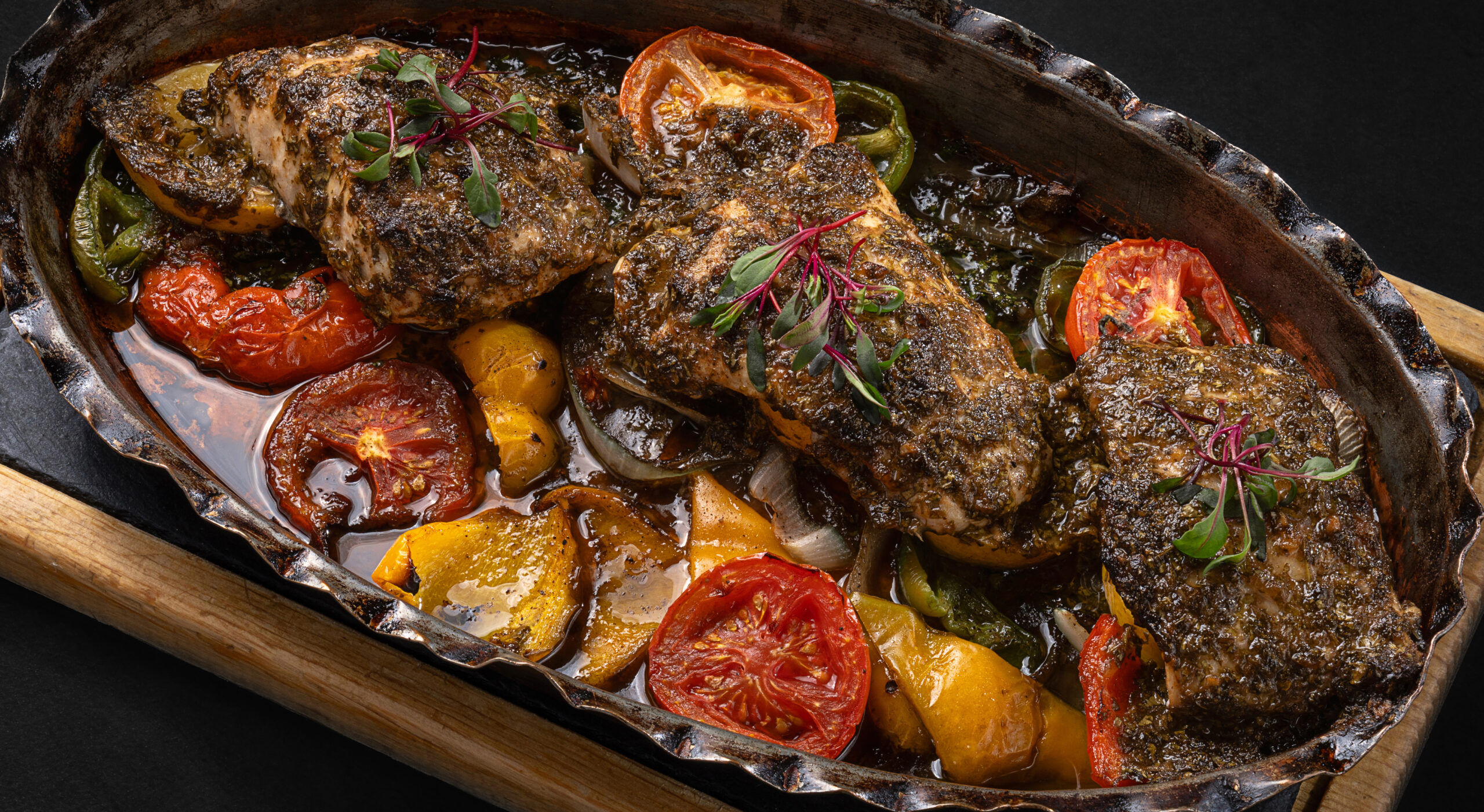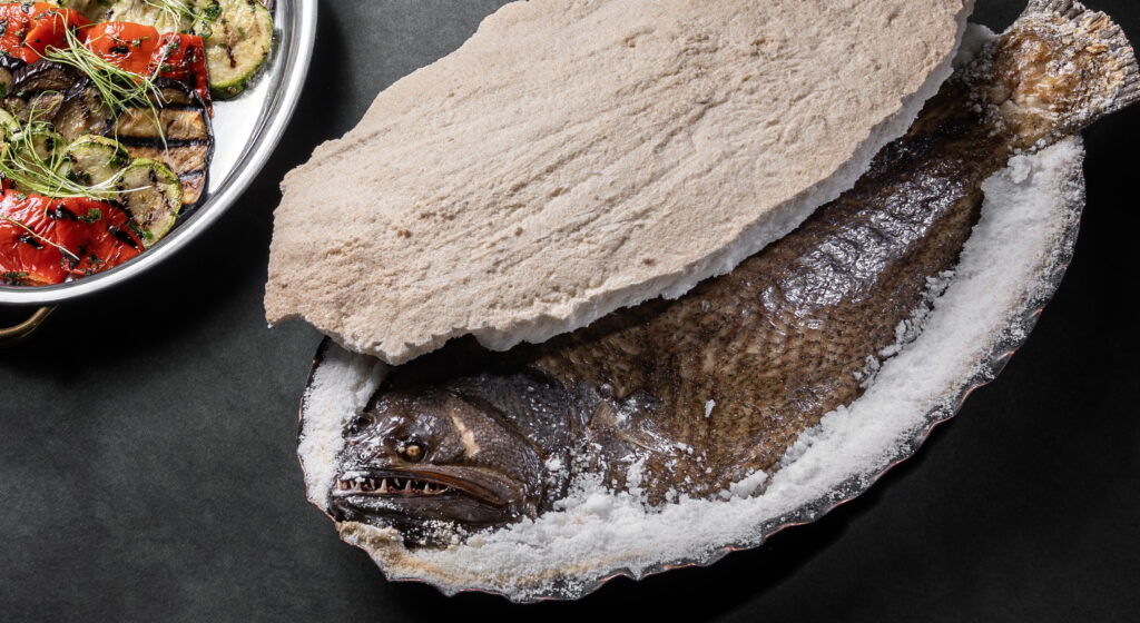 یک عدد ماهی کامل تازه ۱.۴ تا ۱.۶ کیلوگرم در غشاء نمک پخت در فر، همراه با میکس صیفی جات گریل شده.