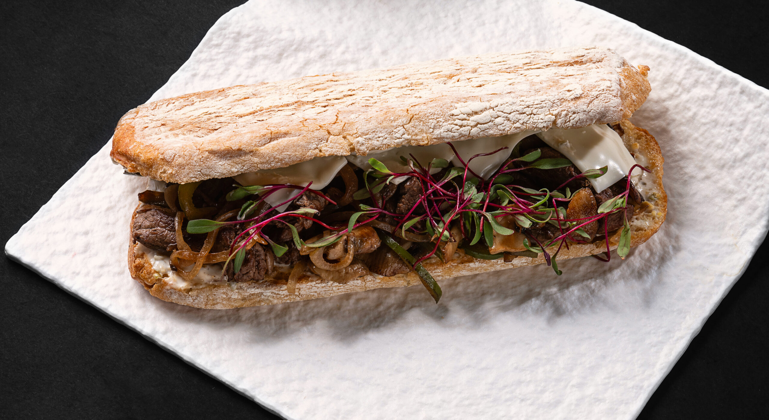 ۱۶۰ گرم فیله گوساله، نان هفت غله، پیاز کاراملایز شده، فلفل دلمه ای، قارچ، پنیر، سس رمولاد و سیب زمینی سرخ شده.