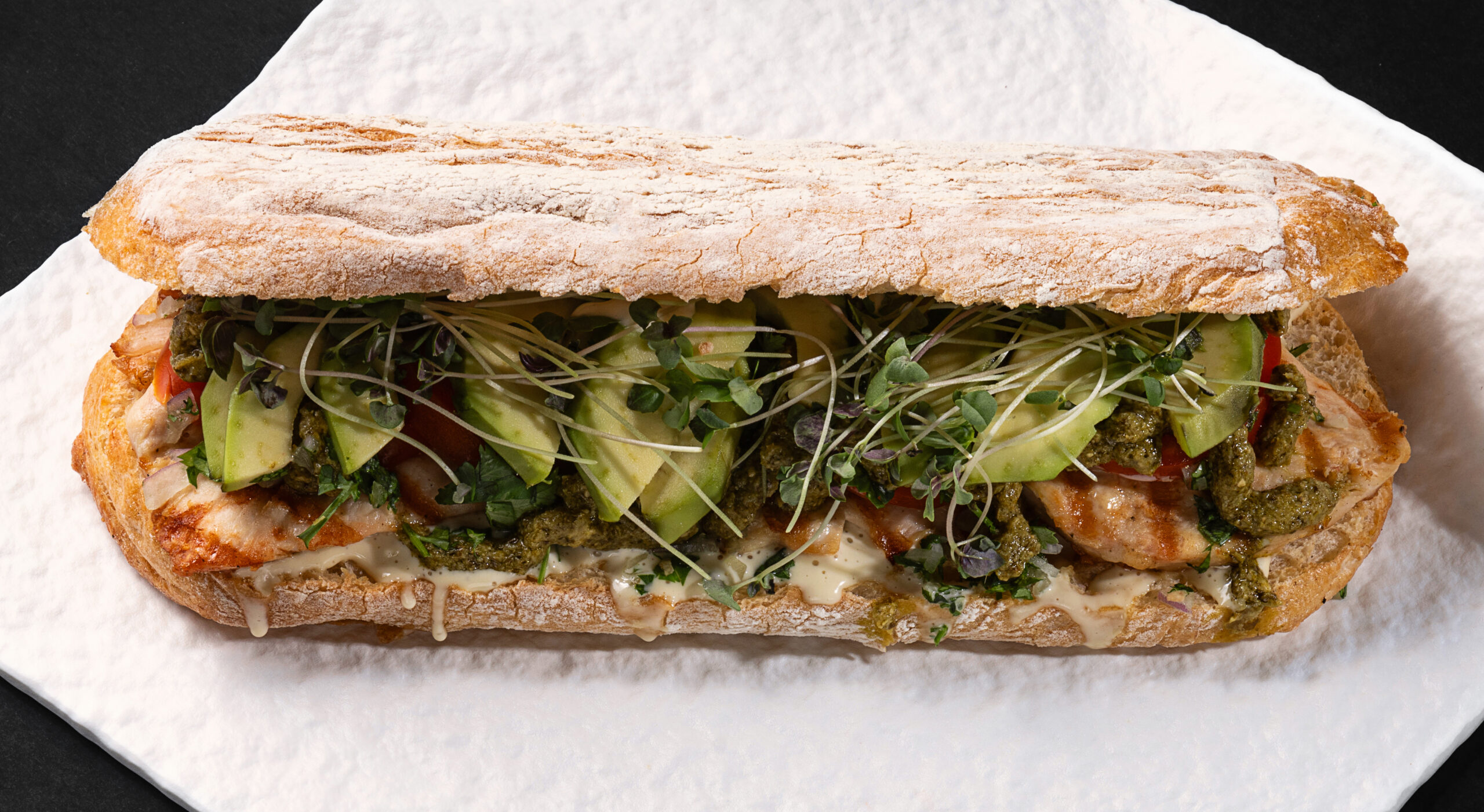 ۱۶۰ گرم سینه مرغ گریل شده ، نان هفت غله، نصف آووکادو، سس پستو ایتالیایی، پیاز، گشنیز، گوجه و سس ایولی به همراه سالاد کوچک.