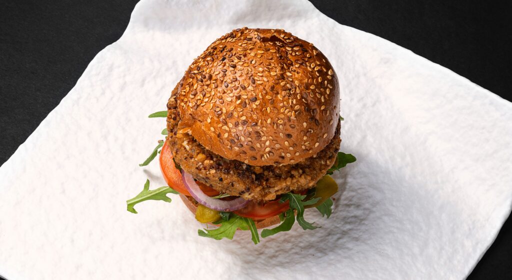 نان برگر، برگر وگان تهیه شده از گل کلم، نخود و ادویه جات، سس مایونز وگان، روکولا، گوجه و پیاز