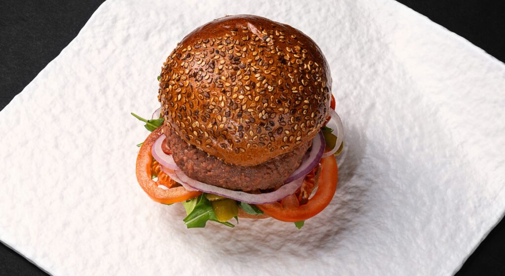 نان برگر، برگر ایمپاسیبل، سس مایونز ویگن، روکولا، گوجه، پیاز به همراه سالاد کوچک